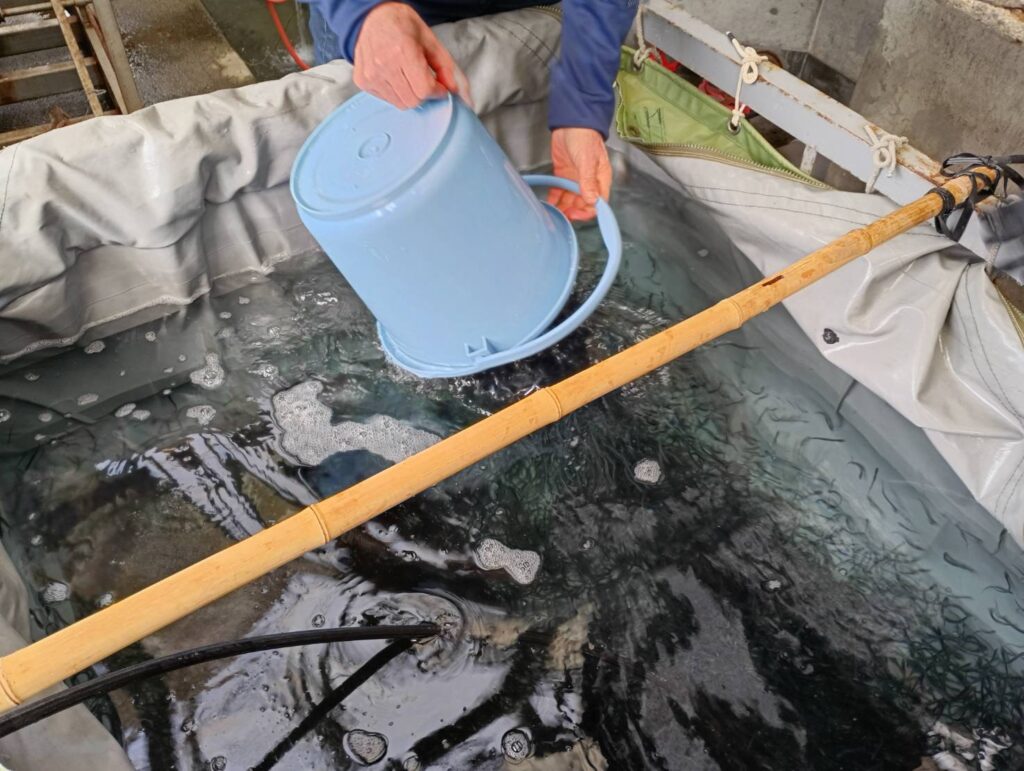 現在約1グラムの鮎を7グラム程度まで育て放流します。